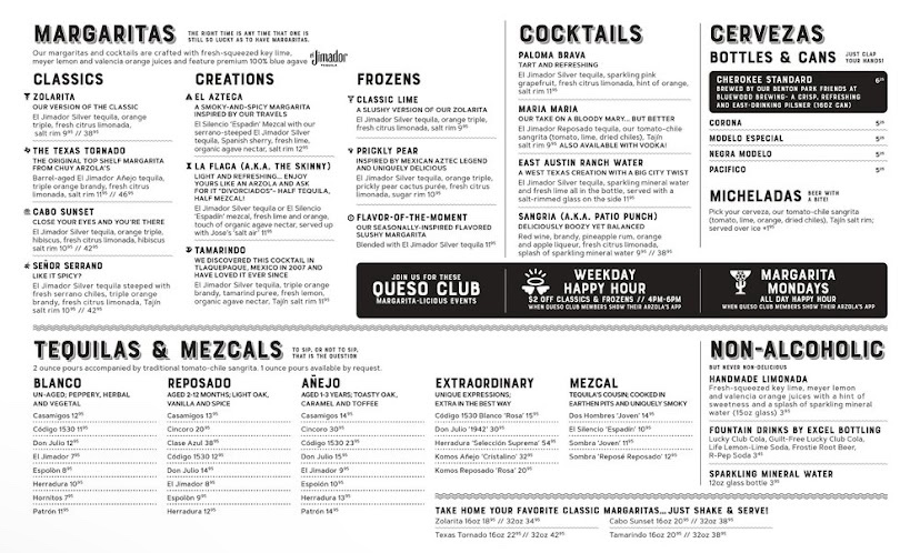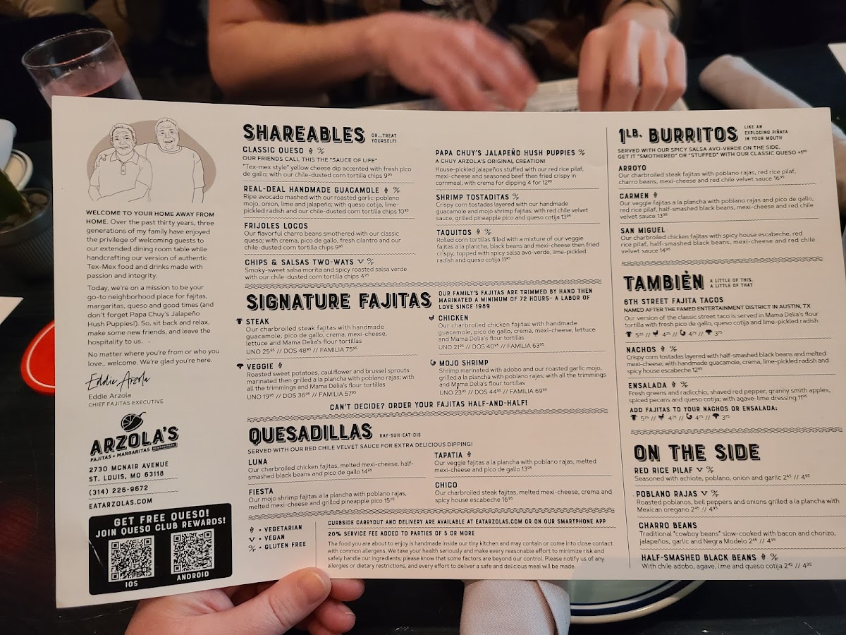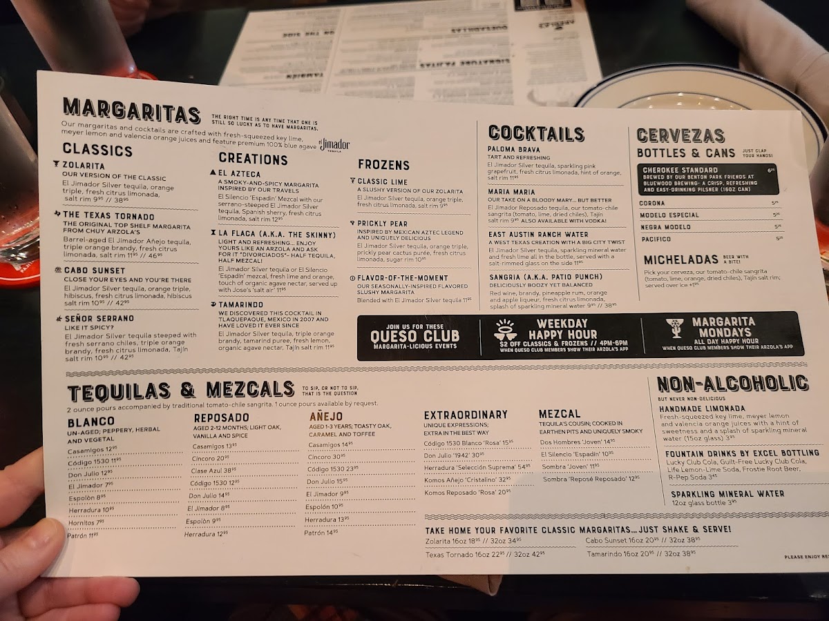 The menu at Arzolas Fajitas Margaritas features a variety of Tex-Mex and Mexican-inspired dishes alongside an extensive selection of drinks suitable for casual dining and social gatherings. The offerings include appetizers, main courses, and beverages designed to complement each other with authentic flavors and traditional preparations.